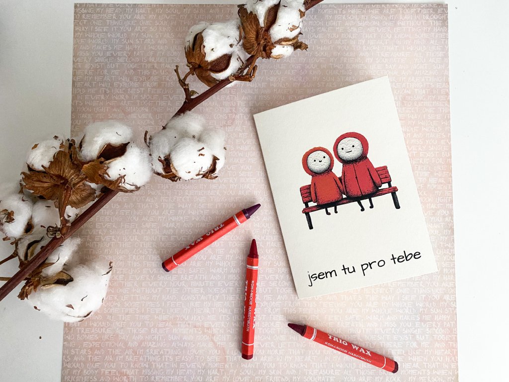 Každé přání je tištěno na kvalitním perlově bílém papíru o gramáži 300 g/m² a velikosti A6, součástí je také obálka ve stejné barvě. Díky minimalistickému designu a originální ilustraci působí elegantně a upřímně.